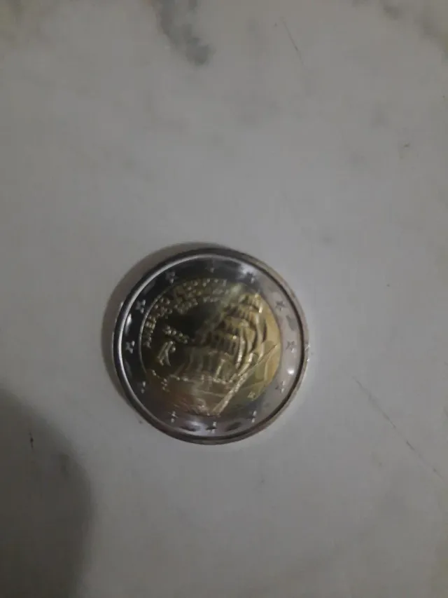 Moneta da 2 euro commemorativa con Amerigo Vespucci. - Dettaglio della nave. - Bordi con stelle.