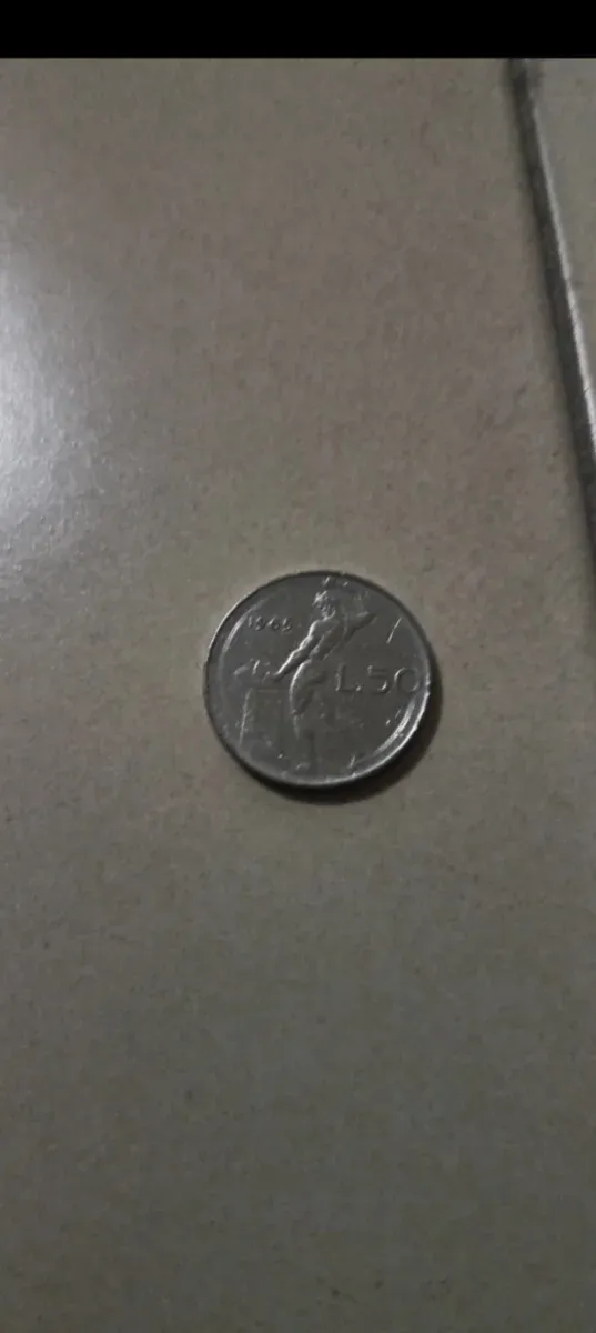 Moneta da 50 lire coniata nel 1952. - Dritto: Figura di un lavoratore con martello. - Rovescio: Stemma della Repubblica Italiana.