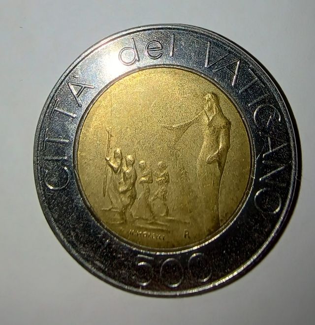Moneta commemorativa da 500 Lire della Città del Vaticano. - Raffigura San Pietro che indica la via. - Bimetallica: centro in ottone, anello in metallo