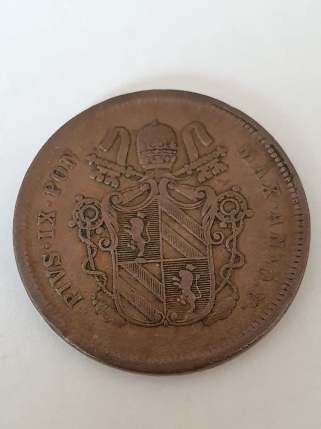 Dettagli del prodottoMoneta in rame del 1849 2 Baiocchi Stato Pontificio quinto anno di pontificato di Papa Pio IX.