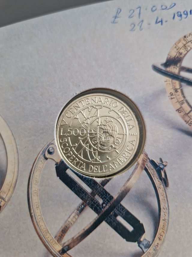 Dettagli del prodottoVendo moneta argento L.500 argento 835 11 grammi celebrativa del V centenario della scoperta dell'America / seconda emissione. Vendo in astuccio originale con scritta in biro nella parte interna della confezione come da fotografia.