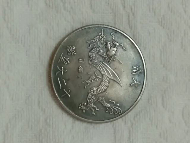 Moneta cinese antica con raffigurazione di un drago. - Design dettagliato del drago. - Caratteri cinesi incisi sul bordo.