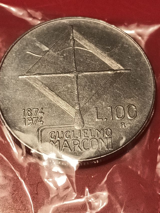 Dettagli del prodottoBellissima moneta commemorativa da 100 lire italiane, in ottime condizioni. Celebrativa di Guglielmo Marconi (1874-1974). - Moneta in argento.- Confezionata in plastica trasparente.