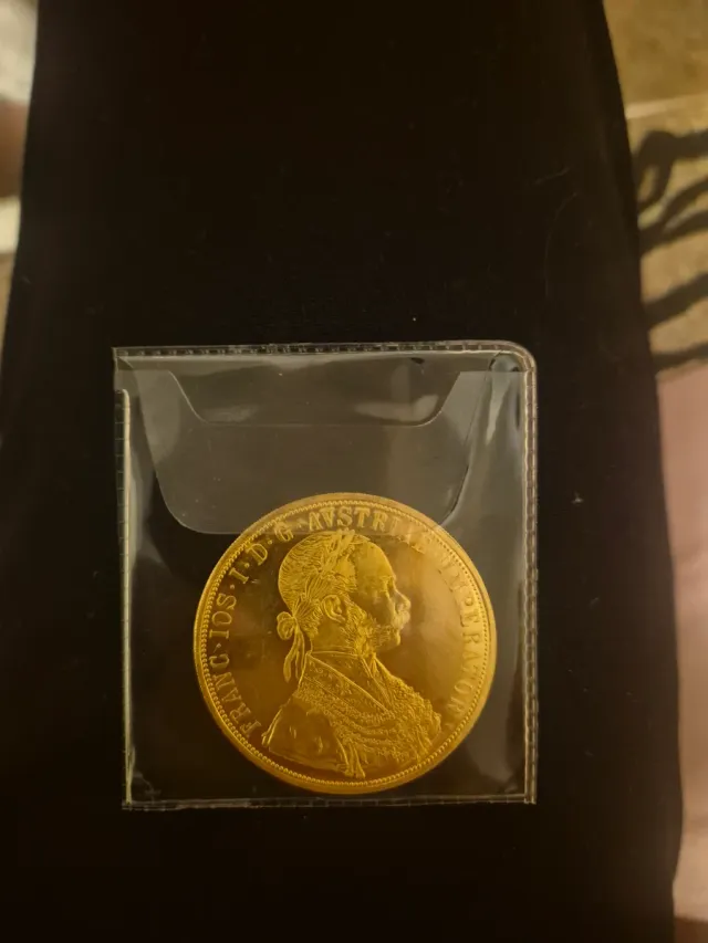 Moneta d'oro austriaca da 4 Ducati del 1915. - Dritto: Ritratto di Francesco Giuseppe I. - Rovescio: Aquila bicipite imperiale.