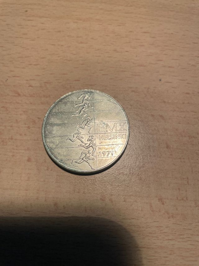 Moneta commemorativa di Helsinki del 1971 da 10 M - Design con corridori in movimento. - Testo EMX HELSINKI 1971 inciso.
