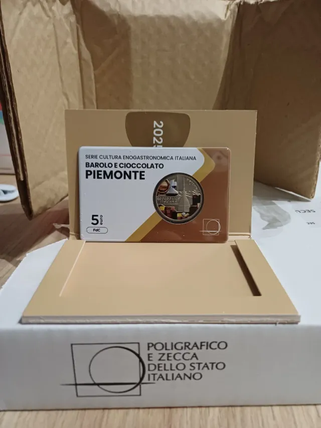 Dettagli del prodottoMoneta commemorativa della serie Cultura Enogastronomica Italiana, dedicata al Piemonte, Barolo e Cioccolato, anno 2025