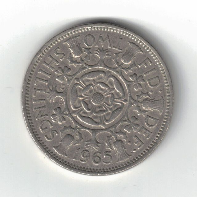 Moneta da due scellini del Regno Unito, coniata nel 1965. - Raffigura la rosa Tudor al centro. - Dettagli incisi sul bordo.