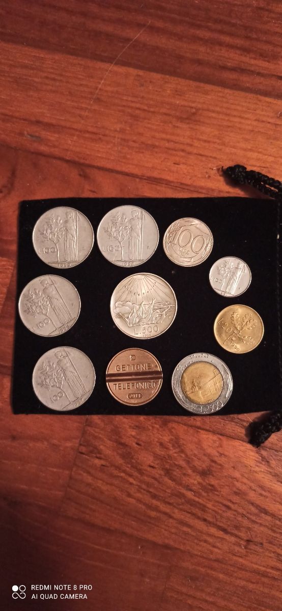 lotto di 10 monete di cui 500 lire d'argento commemorativa 1965,4 da 100lire(1956_7_8_9) una 100 lire piccola una 100 testa turrita, una20 lire una 500lire r un gettone telefonico