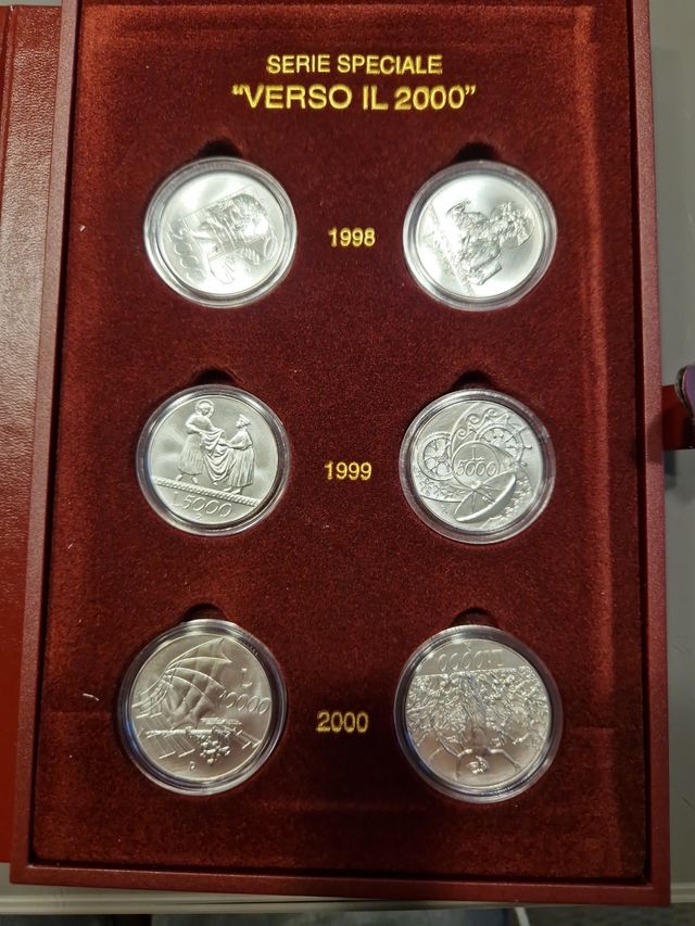 Dettagli del prodottoVendo serie 6 monete in argento 835 del peso l'una di 22 grammi celebrativa dell'anno 2000. 2 monete da L.2000, 2 monete da L. 5000,2 monete da L.10000. Vendo in astuccio originale. Un volantino descrittivo è strappato come da fotografia.