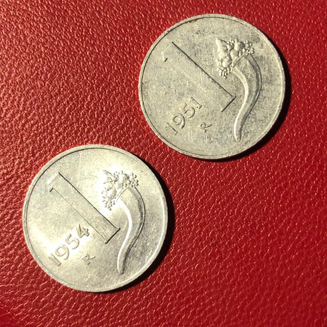 Dettagli del prodottoMonete italiane da 1 lira degli anni '50. Le monete sono in lega di italma (alluminio e magnesio). Presentano una cornucopia sul retro, con la scritta "R" (Roma) e l'anno di conio: 1951 e 1954. La lira è stata la valuta ufficiale dell'Italia fino all'introduzione dell'euro nel 2002. Dettaglio della Cornucopia con frutta.