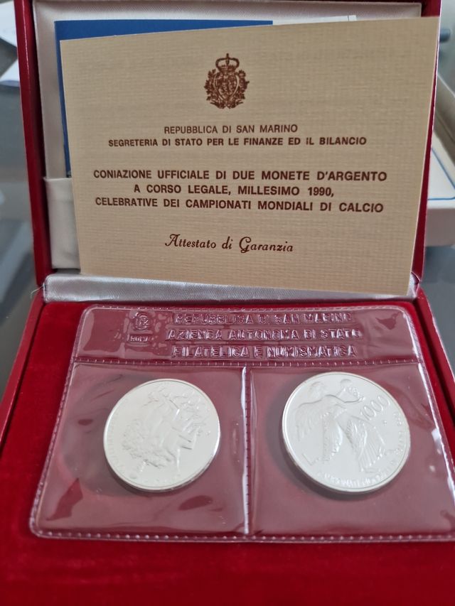 Vendo dittico monete argento 835 con moneta L.500 di 11 gr e moneta L.1000 14.6 gr. Monete celebrative dei campionati mondiali di calcio 1990.