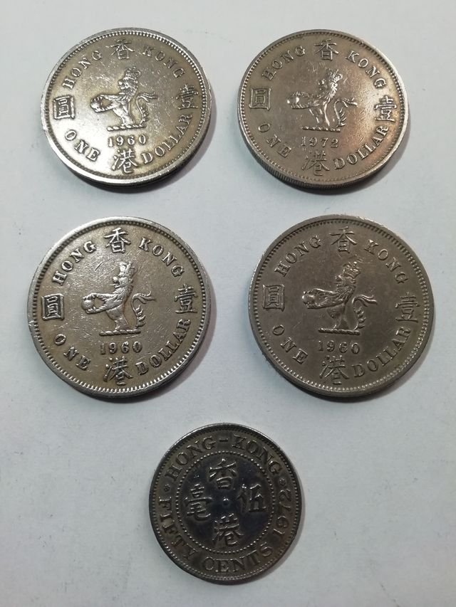 Lotto 5 monete Hong Kong composto da 4 monete One dollar 1960 e 1 moneta Fifty cents 1972. Come da foto