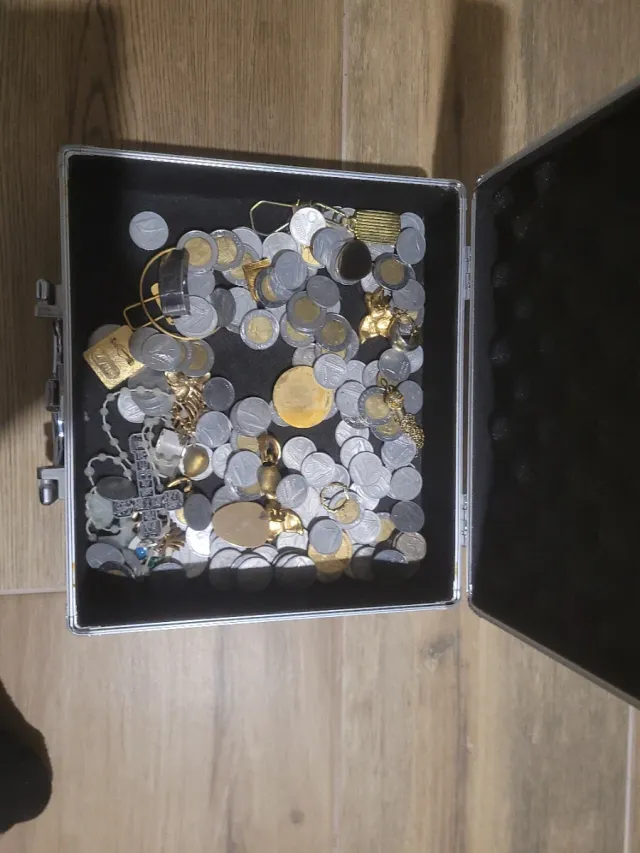 Lotto di monete, tra cui Lire italiane e altre valute. - Diverse monete in metallo. - Alcuni ciondoli e gioielli inclusi.