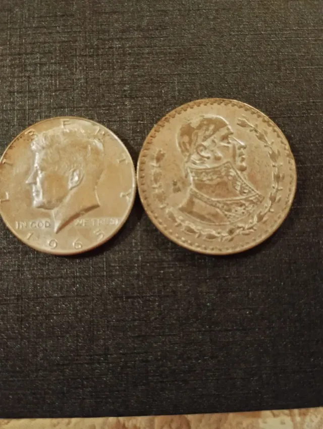 Dettagli del prodottoDue monete, una degli Stati Uniti e una del Messico.