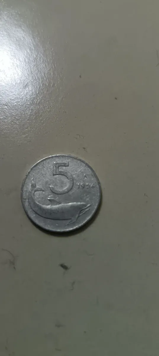 Monetina da 5 Lire del 1954. - Dritto: Raffigurazione di una nave. - Rovescio: Numero 5 e anno 1954.