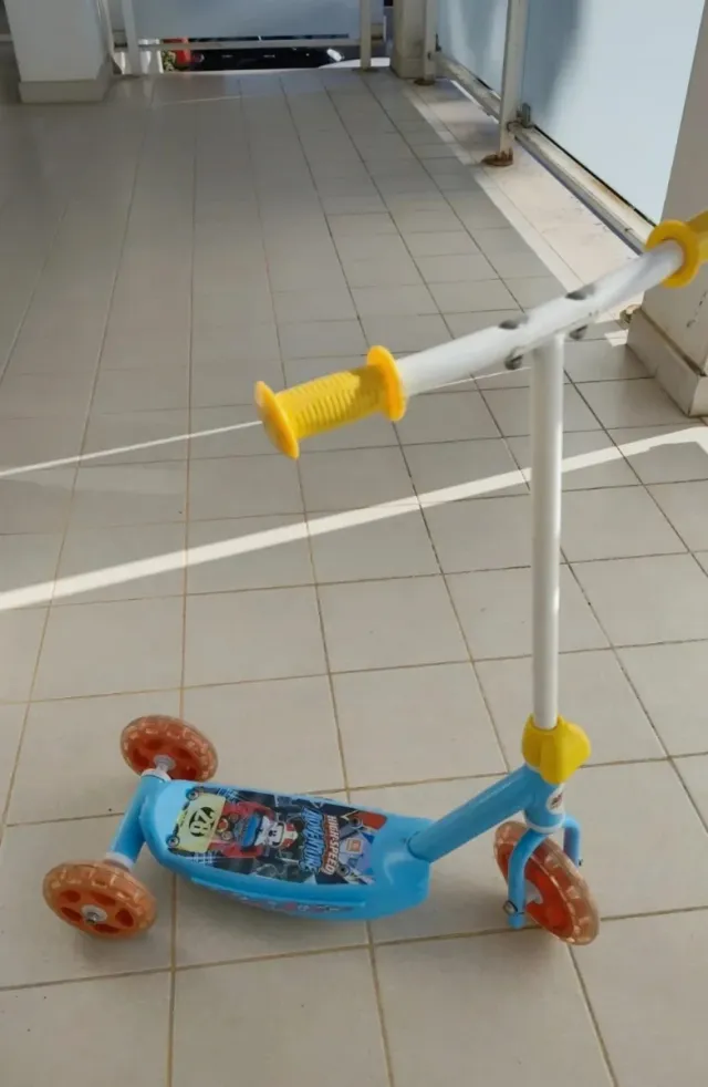 Monopattino a tre ruote con decorazioni di Topolino. - Base blu con grafiche a tema. - Manopole gialle. - Ruote arancioni.
