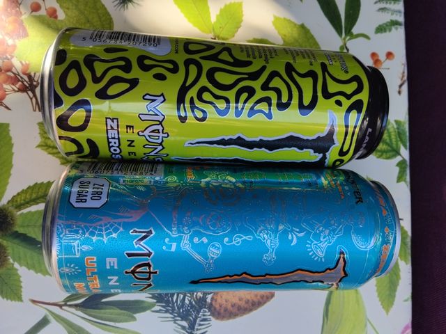 Due lattine vuote di Monster Energy. Una è la versione Zero Sugar, l'altra è la Ultra. Sono in buone condizioni, anche se presentano qualche piccolo segno di usura.