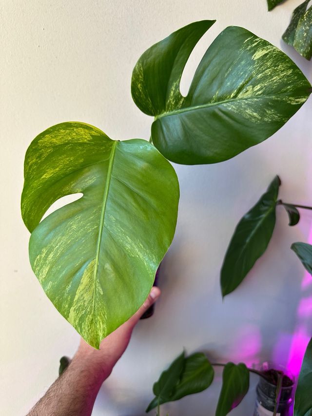 Pianta di Monstera Aurea, varietà Small Form. Le foglie presentano variegature gialle. - Foglie con variegature gialle. - Varietà Small Form.