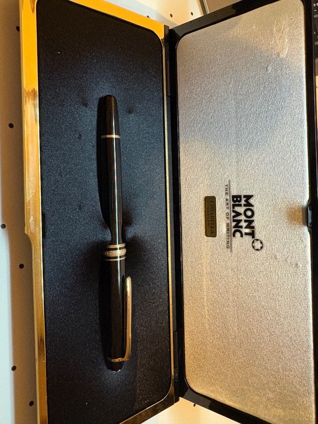 Penna a sfera Montblanc Meisterstuck. - Finitura in resina nera. - Dettagli in oro. - Clip con finitura oro. - Anelli decorati.