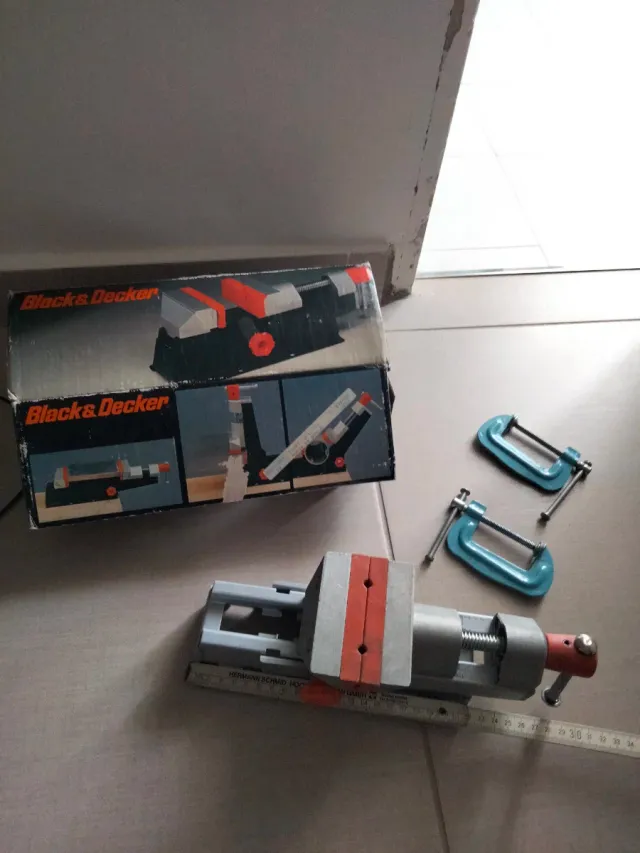 Set di attrezzi composto da una morsa Black & Decker e due morsetti. - Morsa in metallo con ganasce in gomma. - Due morsetti a C in metallo blu.