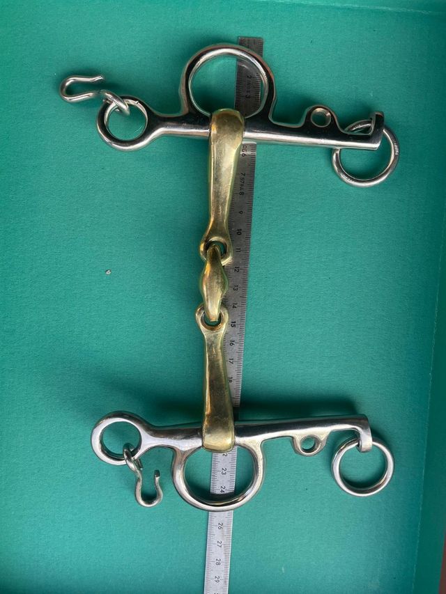 Dettagli del prodottoMorso per cavallo con finiture in ottone e acciaio. Design a doppia articolazione.