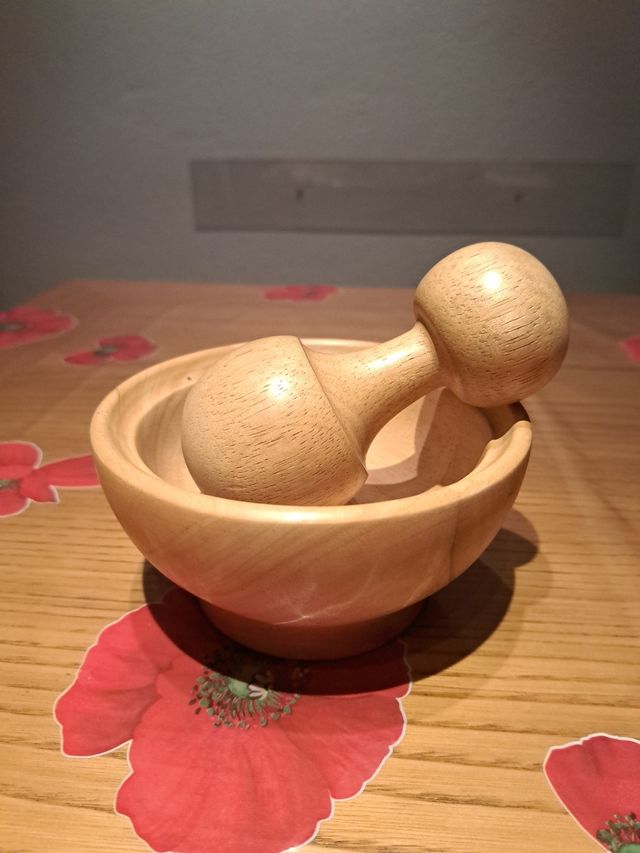 Mortaio con pestello in legno. Cm 14. Mai usato.