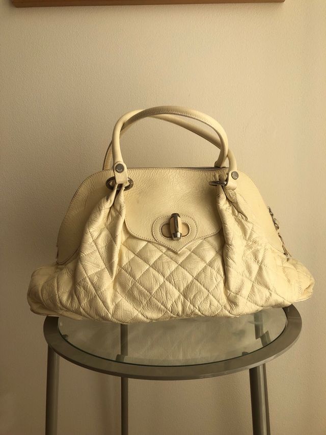 Dettagli del prodottoMoschino donna borsa pelle verniciata clacle’ trapuntata . Col panna. Tasca esternamente con chiusura motivo . Metallari a col nichel. Chiusura con zip e nappa fatta a mano . Sotto dadi in metallo x appoggiare in modo che non si gratti. Fodera interna in raso col beige con tasca e zip . Condizioni discrete bevi foto. Misure lunghezza cm 45. Altezza cm 30. Larghezza cm. 20