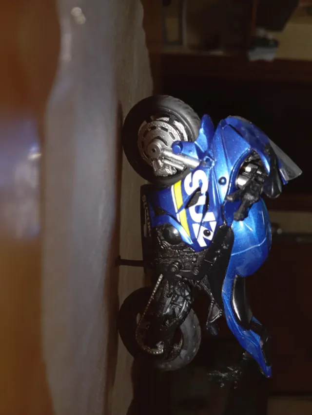 Dettagli del prodottoModellino di moto Suzuki in scala ridotta, con una vivace colorazione blu e dettagli gialli.