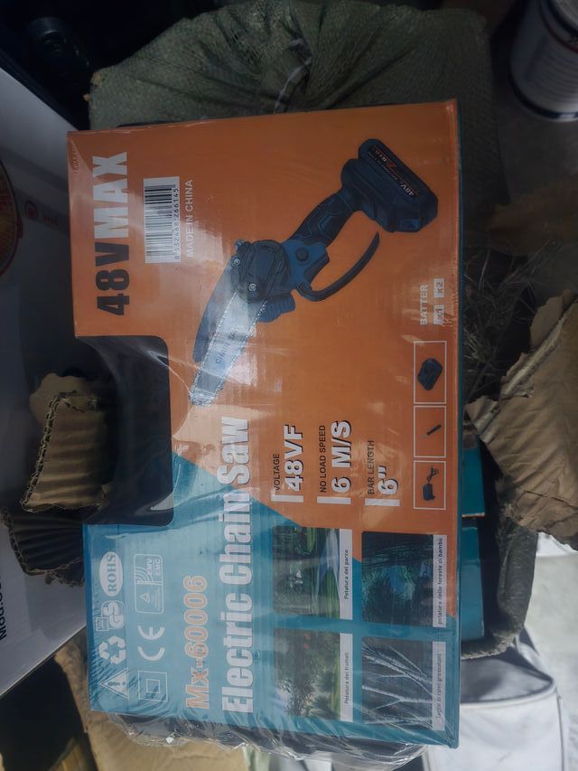 Motosega a doppia batteria da 6 pollici. Imballata - Voltaggio: 48VF - Velocità a vuoto: 6 M/S - Lunghezza barra: 6 - Marca: 48VMAX - Made in China