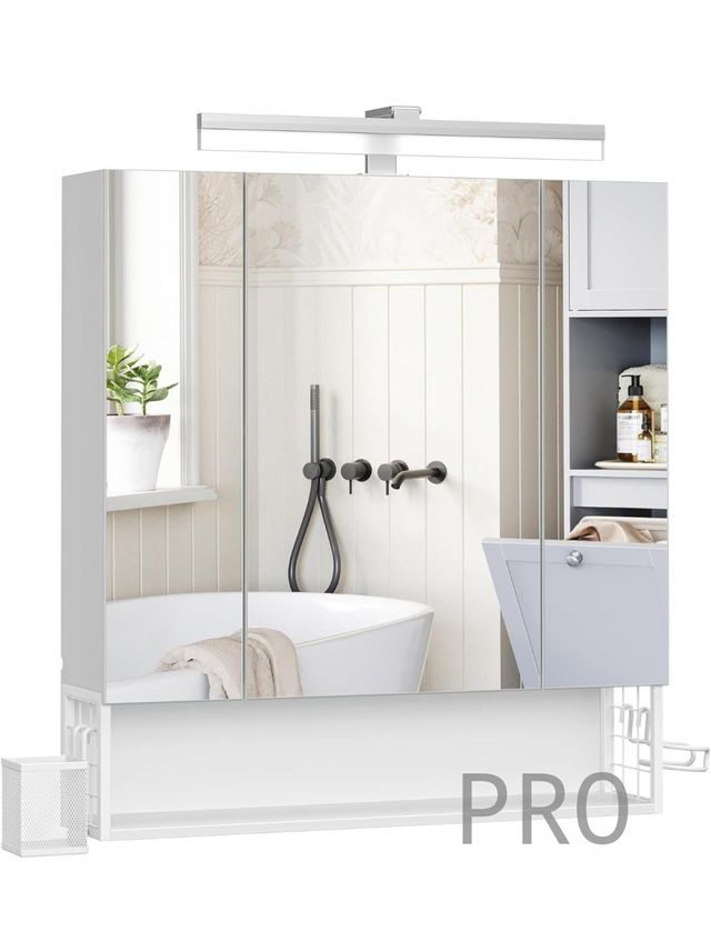 Mobile bagno VASAGLE con illuminazione LED, 16,5 x 70 x 75 cm, presa multipla, cesta a sospensione, supporto asciugacapelli, per lavabo, bianco nuvola BBK126W01