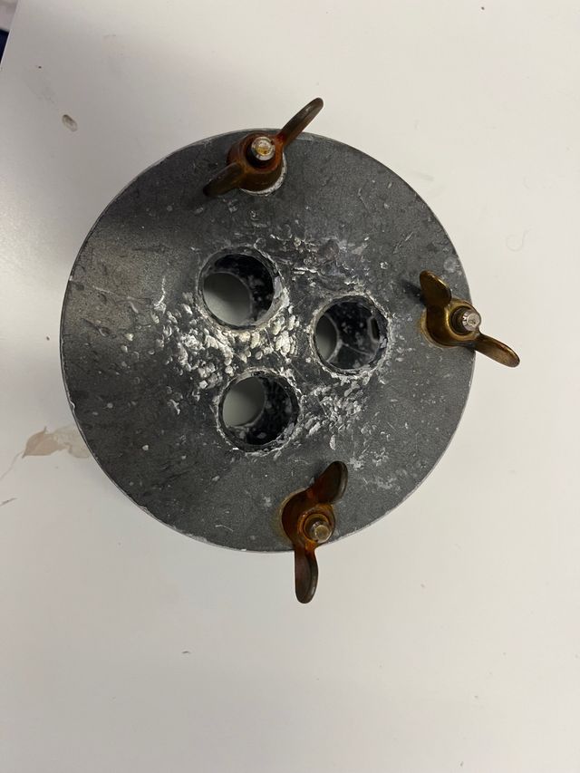 Muffola per uso odontotecnico, realizzata in metallo. - Struttura circolare con tre fori. - Dotata di tre viti a farfalla per la chiusura.