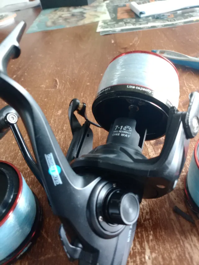 Mulinello da surf casting con 2 bobine di ricambio. - Bobina principale con filo. - le 2 Bobine di ricambio con filo. - Design nero e rosso.