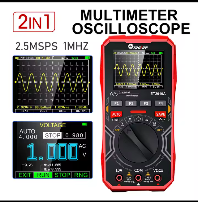 Multimetro grandi cifre con oscilloscopio. Larghezza di banda 1Mhz, campionamento 2.5Mhz. Automatico e manuale.
