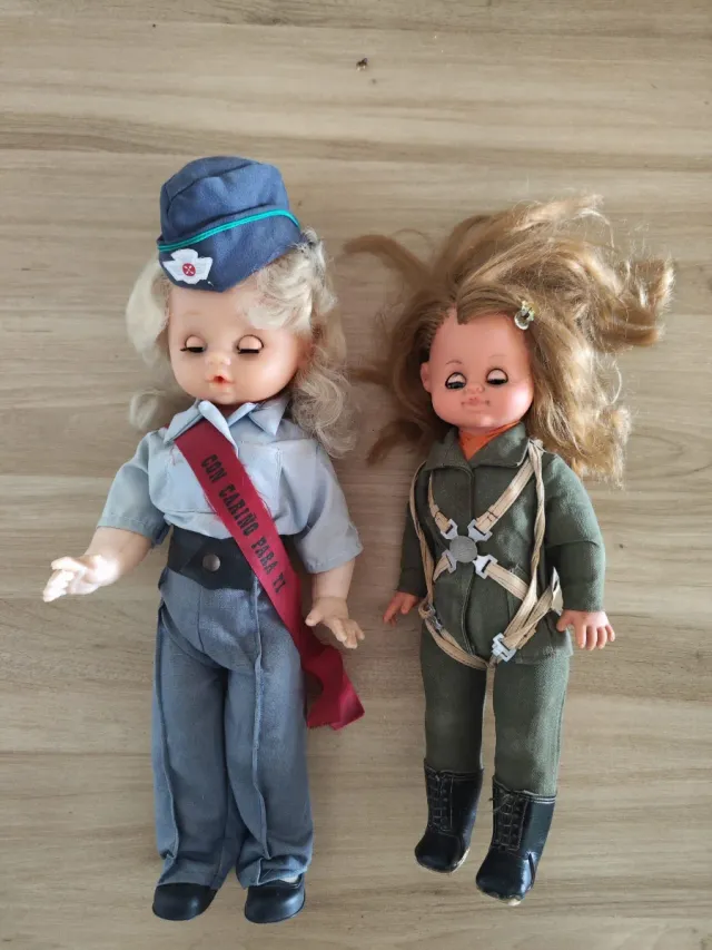 Dettagli del prodottoLotti di due bambole classiche conosciute come 'bambole della mili' o 'Wendalina', popolari in Spagna negli anni '70 e '80. Erano regali comuni che i soldati facevano alle loro fidanzate o madri durante il servizio militare obbligatorio. La bambola a sinistra indossa l'uniforme dell'aeronautica e una fascia che dice 'CON AMORE PER TE', indicando il suo scopo come regalo. La bambola a destra indossa un'uniforme di paracadutista con imbracature. Si possono trovare diverse versioni che rappresentano gli eserciti di terra, aria e mare. La descrizione è stata tradotta automaticamente.