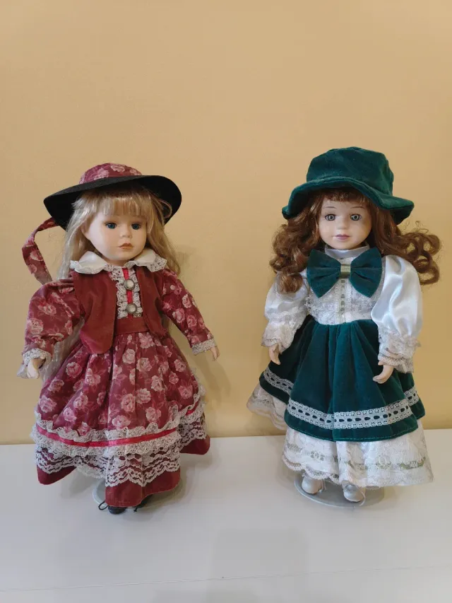 Dettagli del prodottoSet di due bambole da collezione con dettagli in ceramica. Vestiti dettagliati con pizzi. Cappelli abbinati agli abiti. Espressioni facciali delicate. La descrizione è stata tradotta automaticamente.