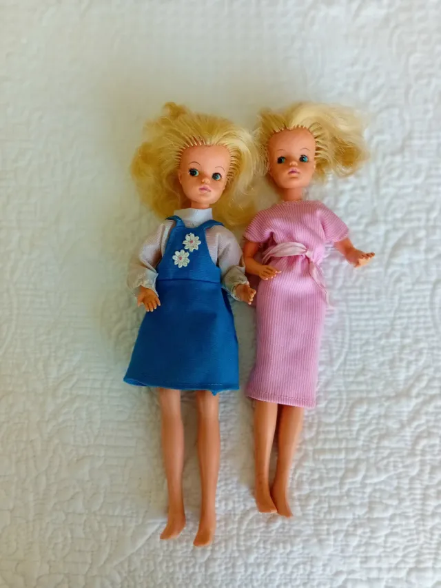 Due bambole Sindi di Famosa. - Bambola con vestito blu e camicetta bianca. - Bambola con vestito rosa.