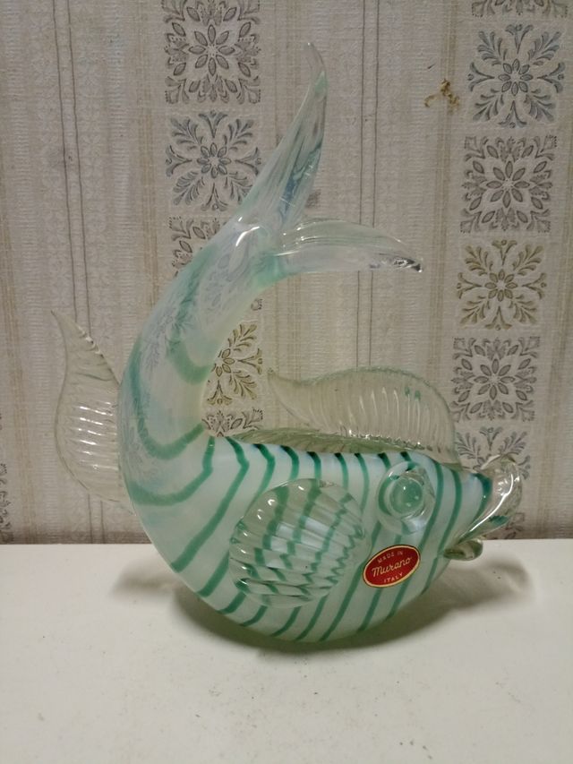 Dettagli del prodottovetro di Murano sommerso pesce in vetro opalino bianco con righe verdi, ricoperto da vetro bianco trasparente,cm.22x18 peso kg 0,500 prodotto nella fabbrica MAZZEGA in Murano negli anni 60, proviene da una collezione privata*****PERFETTO***** € 80 non trattabile
