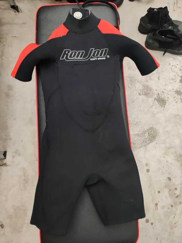 Muta da bambino a maniche corte e gamba corta, ideale per le attività acquatiche. - Colore nero con inserti rossi. - Logo Ron Jon Surf Shop sul petto.