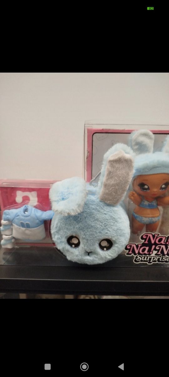 Dettagli del prodottoPeluche Na Na Na Surprise Aspen Fluff, un adorabile coniglio blu.
