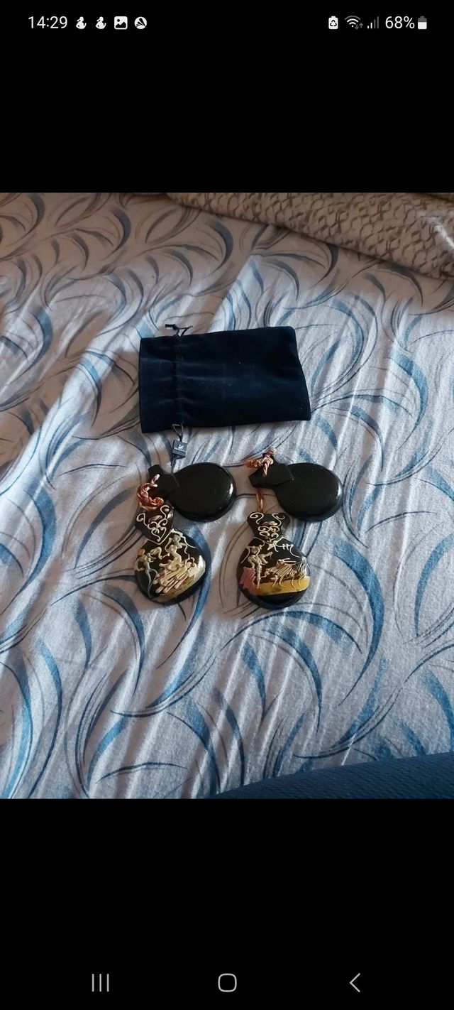 Nacchere in legno con decorazioni dipinte a mano. - Set di due nacchere. - Decorazioni colorate su sfondo nero. - Include sacchetto porta nacchere.
