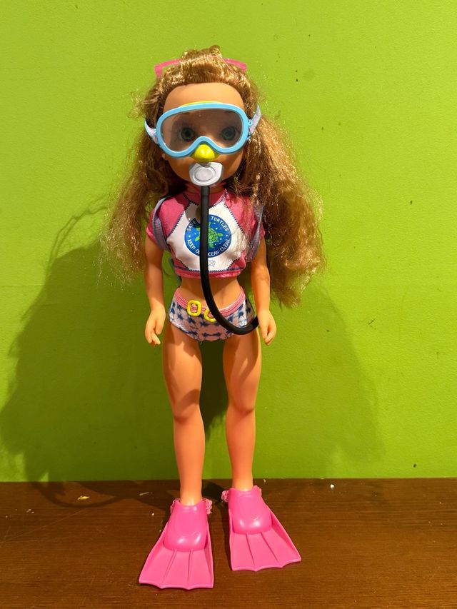 Dettagli del prodottoBambola Nancy con tema di salvataggio delle tartarughe marine. È equipaggiata per un'avventura subacquea. Include maschera da snorkeling con tubo, costume da bagno con design di tartarughe e pinne da snorkeling rosa. La descrizione è stata tradotta automaticamente.