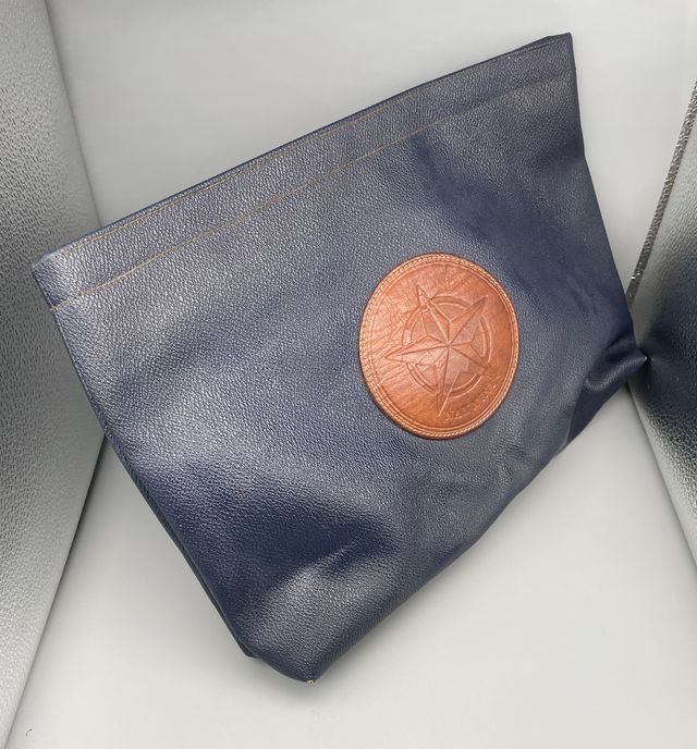 borsa borsetta case beauty con strap interno e tasca con zip interna. Logo in rilievo rosa dei venti. borsa rigida blu marino unisex. Lieve "difetto", consumata ai bordi inferiore, parte sotto. Made in Italy MISURE: 25x37 cm circa