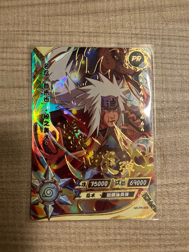 Carta collezionabile Naruto Kayou. - Personaggio: Jiraiya - Sigla: PR - Attacco: 75000 - Difesa: 69000 - Abilità: Gama-Yūen Dan - Codice: NR-PR-009