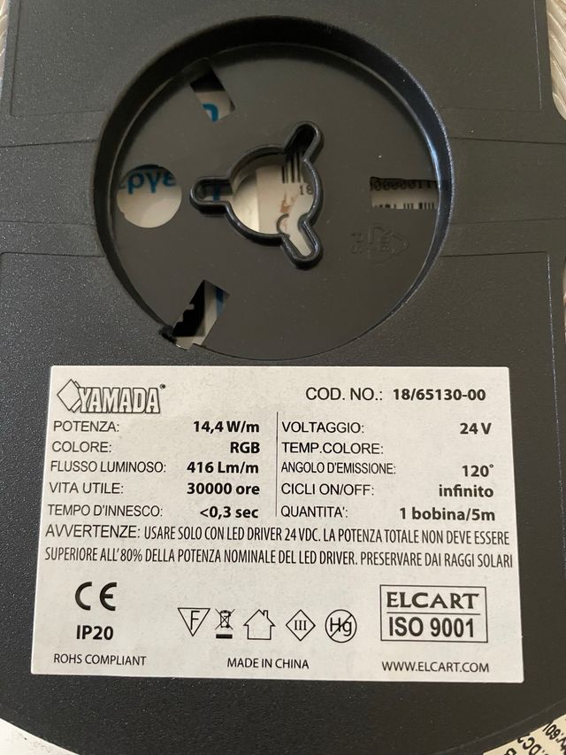 Vendo nastro LED RGB YamaDa. Perfetto per progetti fai da te o illuminazione d'accento. - Lunghezza: 5 metri - Potenza: 14.4 W/m - Colore: RGB - Angolo di emissione: 120° - Voltaggio: 24V - IP20