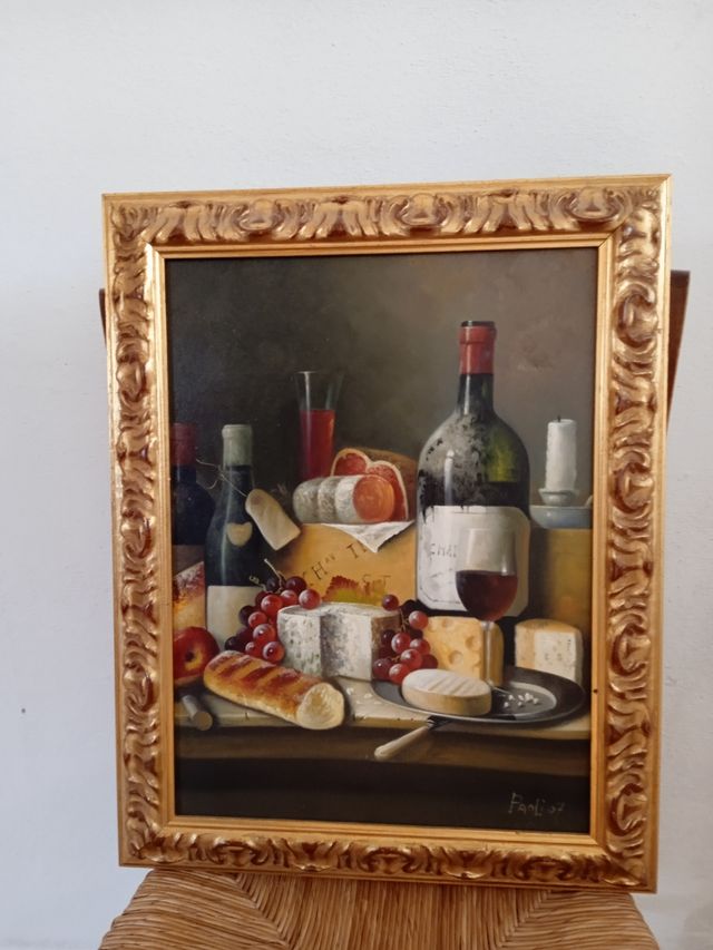 Dettagli del prodottotela30x2x40 Natura morta vino formaggio frutta candela.39x4x49 Cm. con cornice. Misure del prodotto