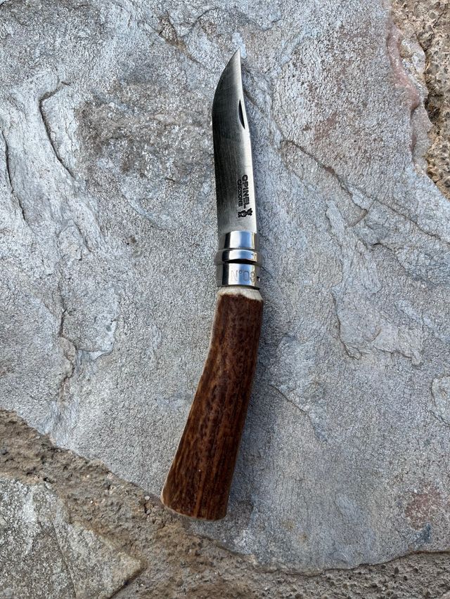 Coltello artigianale con manico in corno. - Lama in acciaio. - Sistema di bloccaggio di sicurezza.