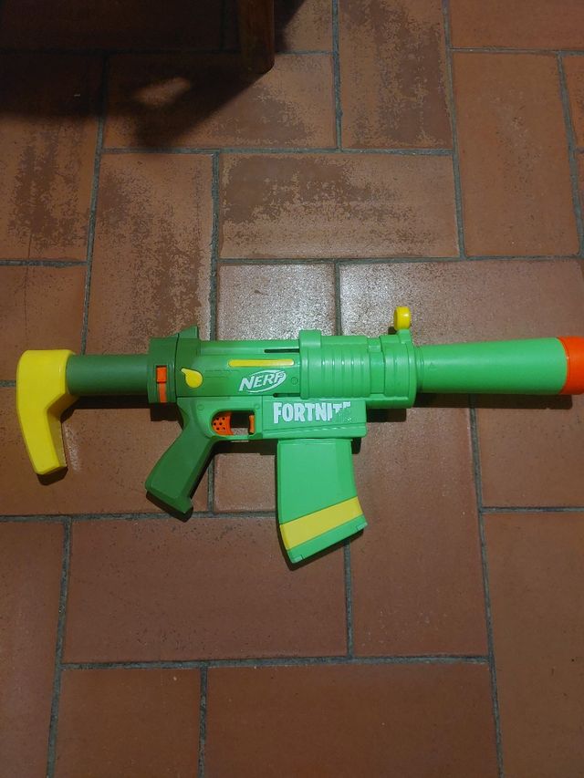 Dettagli del prodotto Fucile Nerf x Fortnite. Fucile a molla con calcio e "silenziatore" removibili. Caricatore originale. È in buone condizioni con però alcuni segni di usura come la scritte "Nerf" rovinata. Lo sportellino di accesso al caricatore manca (vedi foto), cosa che però non compromette in nessun modo il corretto funzionamento.