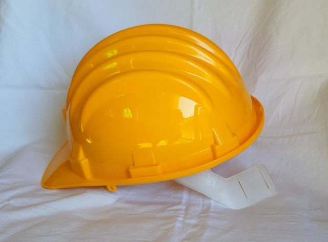 Elmetto in politene giallo - Adamello Bardatura in plastica regolabile a 6 punti Isolamento elettrico fino a 440 V Fascia antisudore Peso: 380 g circa taglia unica