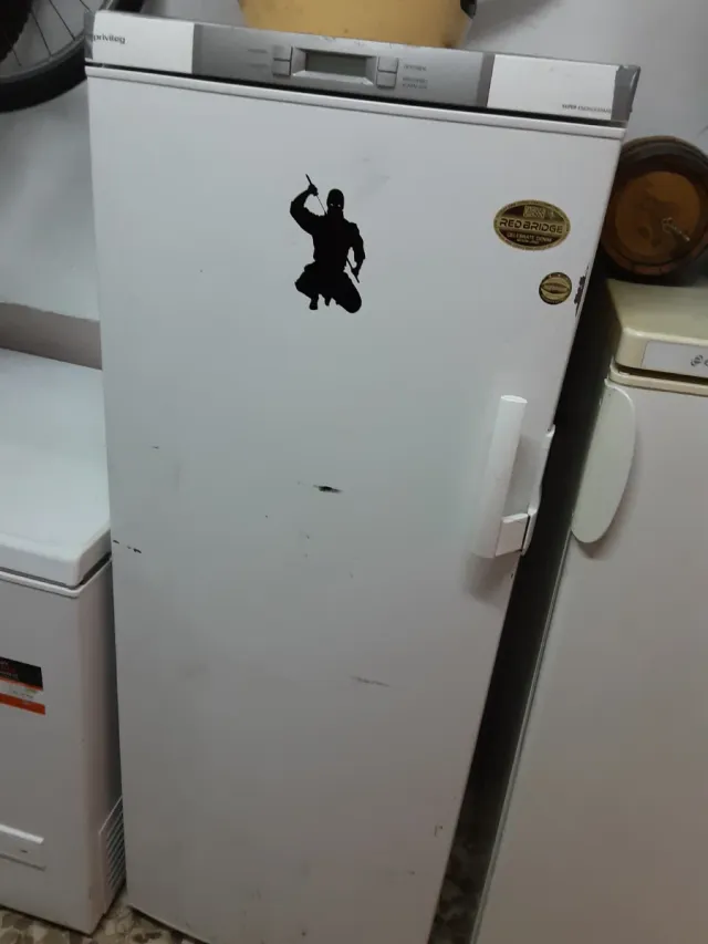 Dettagli del prodottoFrigorifero congelatore di colore bianco, con un design verticale e un vinile decorativo di ninja. - Porta con maniglia bianca. - Pannello di controllo nella parte superiore. La descrizione è stata tradotta automaticamente.