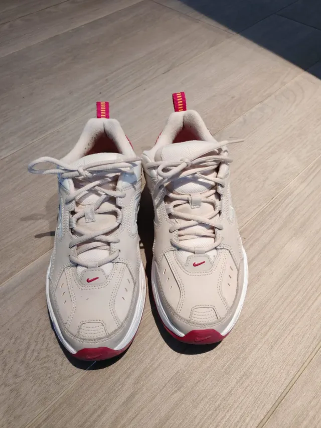 Scarpe Nike M2K Tekno in tonalità beige con dettagli rosa.